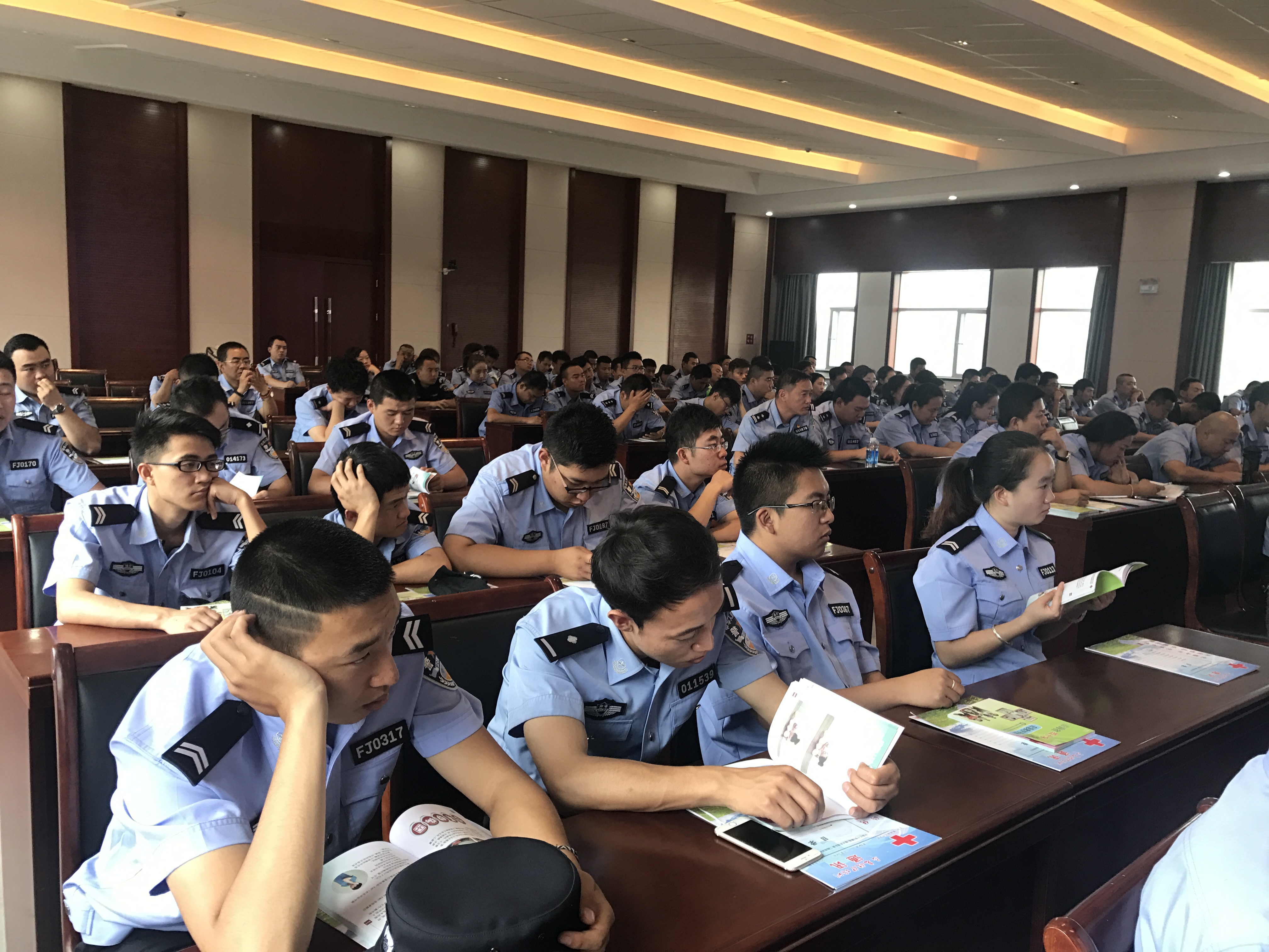 培训从近几年的突发事件入手,韩老师采取理论讲解与实际操作相结合的方法,根据公安行业的特殊性及特点,向大家讲授了应急救护新概念、拨打120电话的注意事项、急救生存链和心肺复苏术、创伤救护知识等,并结合授课内容现场模拟演示,百忙之中抽出时间参加培训的干警们学习十分认真,并且亲自操作、亲身体验。