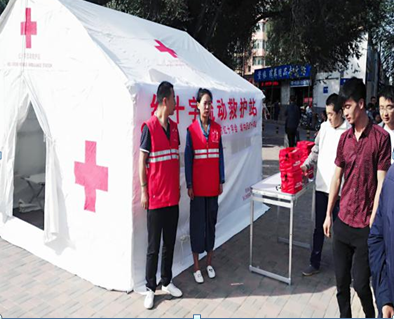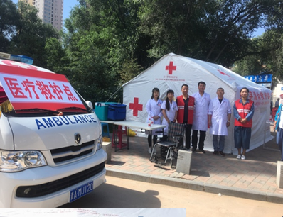 天蒙蒙亮时,城中区红十字会长和工作人员、医护人员、志愿者陆续达到服务站建设点着手搭建帐篷、准备药具,为赛事的顺利进行做好各项保障工作,服务站配备了红十字急救箱、急救床、血压计、轮椅、氧气袋、冰袋、口服和外伤处置药品、针剂等救护服务用品,并安排了4名医护人员和红十字志愿者开展医疗救护和义诊服务等工作。